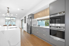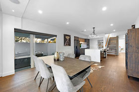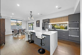 The open-plan dining room and kitchen meet the expectations of entertainers centred around a Marbello engineered stone island and supported by dual ovens, a wine fridge and a walk-in pantry.